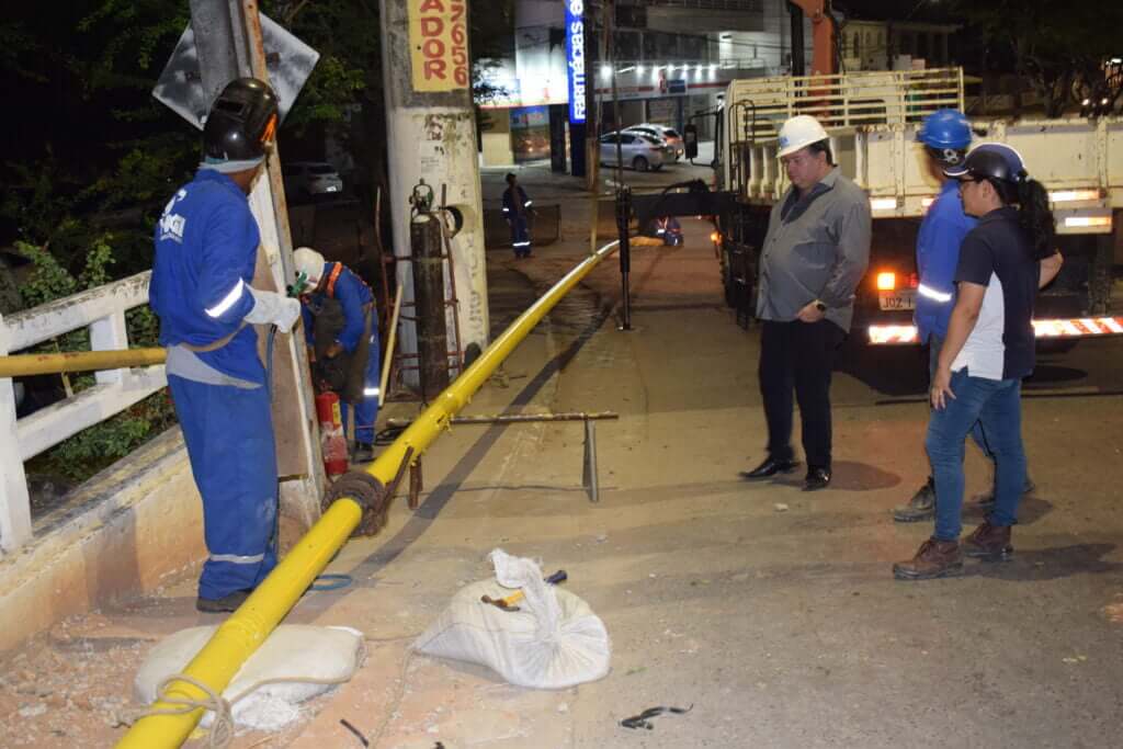 O gerente do setor de engenharia da Companhia, o engenheiro Victor Barbosa, explicou que durante a madrugada foi realizada a implantação do duto dentro da galeria coberta da ponte, com extensão de 50 metros. “Foi realizado o lançamento de duto de aço no interior da galeria da ponte, realizada solda de aço e revestimento, e lançamento de duto de PEAD dentro do tubo camisa de aço. Com essa obra a companhia também irá beneficiar a comunidade ao realizar a substituição do todas as tampas da calçada que não se encontrava em bom estado de conservação, além disso, irá pintar toda a extensão do passeio por onde passam os pedestres e o dois guarda-corpos”, informou.